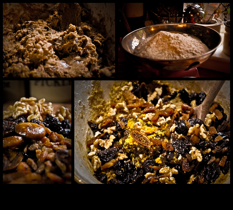 To this I then add whatever I have in the pantry. Today included handfuls each of chopped prunes, figs, sultanas, walnuts and stem ginger (and a glug of the syrup). A tablespoon of treacle, then the spices: cinnamon, allspice, nutmeg/mace are my favourites at Xmas. Grated zest of an orange and lemon and then a few tablespoons of last years extremely boozy mincemeat. The sugar and booze have preserved it and it is now the most luscious mincemeat ever. Its ridiculously boozy and contains, as far as I can remember, brandy, rum, port, whisky and some more sloe brandy for good measure. The flavours have had a whole year to develop and mellow together and it is going to be in most of my Xmas concoctions this year.