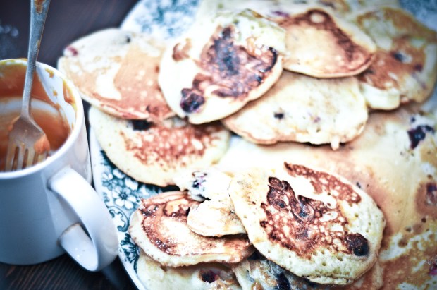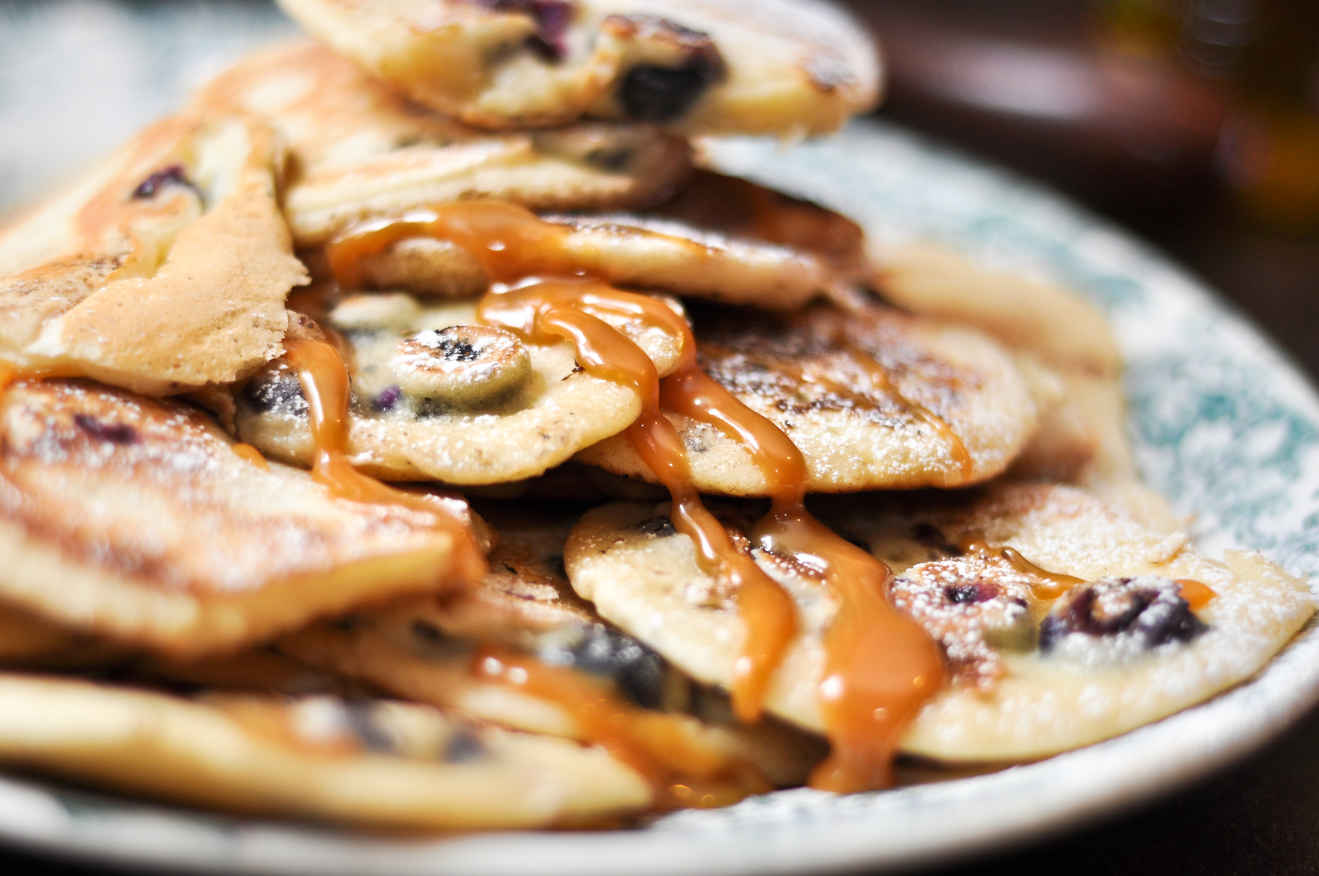 I really hadn’t intended to make any pancakes at all today but I needed to buy some milk so popped to the shop only to discover a pack of blueberries reduced to 99p. Well I took that as a sign that actually yes, I should make pancakes, lots of pancakes to celebrate this little find and, as my love affair with salted caramel reigns strong, it seemed a natural pancake buddy. You can buy jars of salted caramel in the shops but they’re, quite frankly, way too tiny and you don’t get those lovely flakes of sea salt in them so its nice to make a big jug of your own, that way you can guzzle it whilst your pancakes are cooking and still have plenty left for drizzling.