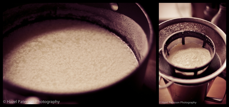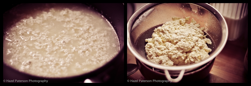 A quick shout out on Twitter for suggestions for the leftover whey brought a resounding call for ricotta. Another quick look online for a really simple method resulted in me finding this method which seemed by far the easiest.