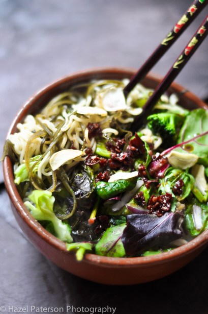 Just take a handful of dried kelp strands and add them to water that has had the noodle flavour sachet added and cook for a few minutes before adding your noodles. Chuck in any leftover bits of veg – broccoli, peas, cabbage, whatever is floating in the bottom of your fridge really. Cook for a minute then tip into a big bowl, cover with leftover salad, pour over your spiced fermented coconut water, some Chinese chillies preserved in oil and some dried garlic slivers and you have an amazing bowl of loveliness.