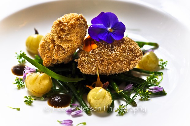The only flower that is purely for decoration is the violet on the top of the dish. Parsley, chive and onion flowers are incredibly concentrated and without these the dish will suffer. The 2 tarragon leaves add a lovely burst of aniseed to the dish and in just the right amount. I don’t think you should put stuff on a plate that doesn’t contribute to the dish, the violet is there because it looks pretty and is edible, it’s value is sensory, and a dish should make you happy in a holistic fashion (my god that sounds really wanky but its absolutely true in this instance!).
