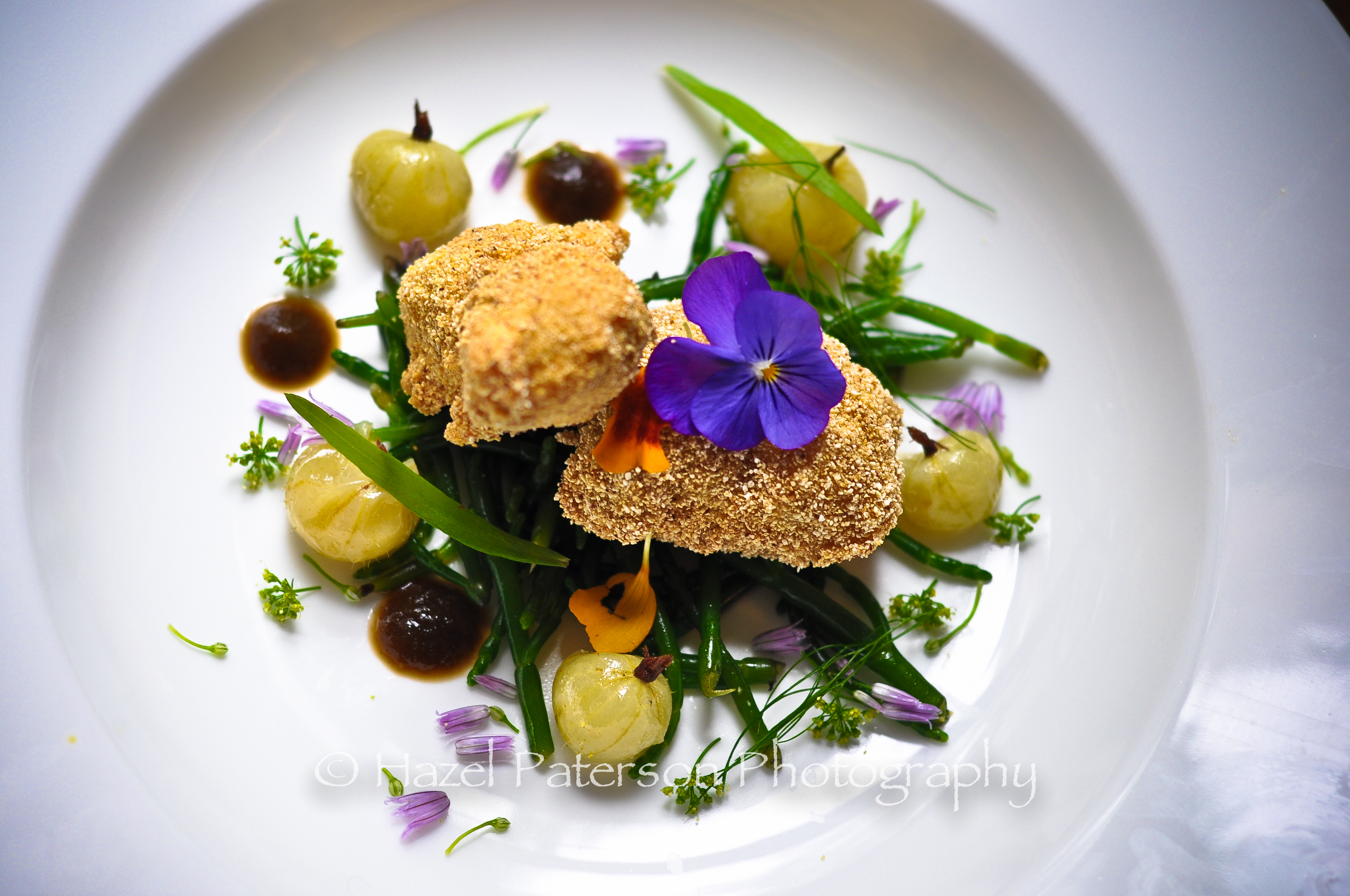 - To assemble simply put some of your smoked butter samphire on a dish, top with sweetbreads, surround with your elderflower poached gooseberries (and a bit of syrup), dot splurges of your sweet ketchup and scatter your herbs and flowers evenly about the plate. Dead easy, really tasty.