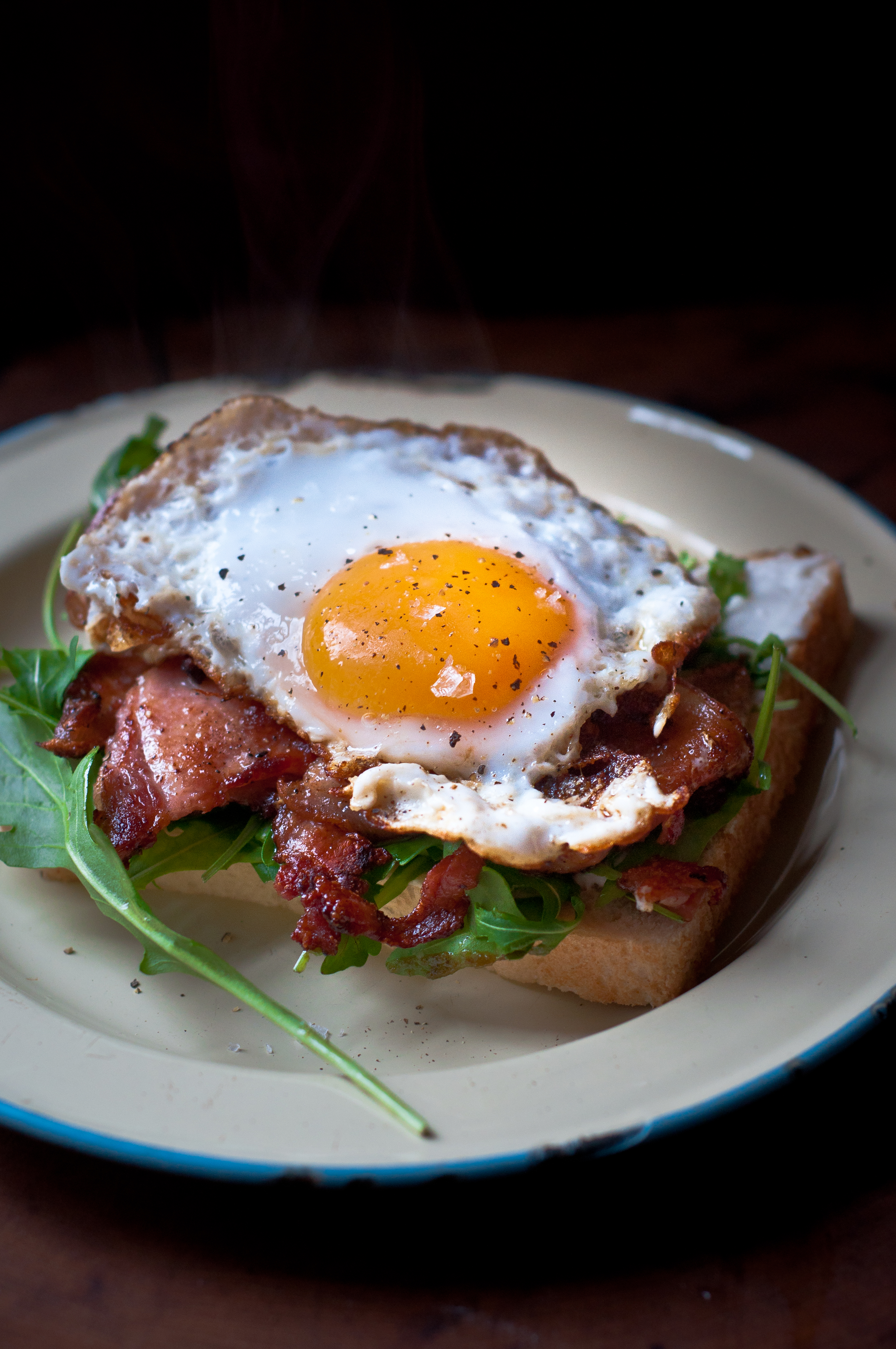 - Mayo and ketchup your bread, add a layer of fresh rocket leaves then add the crispy bacon and top with your duck egg, season then pop your bread lid on and tuck in.