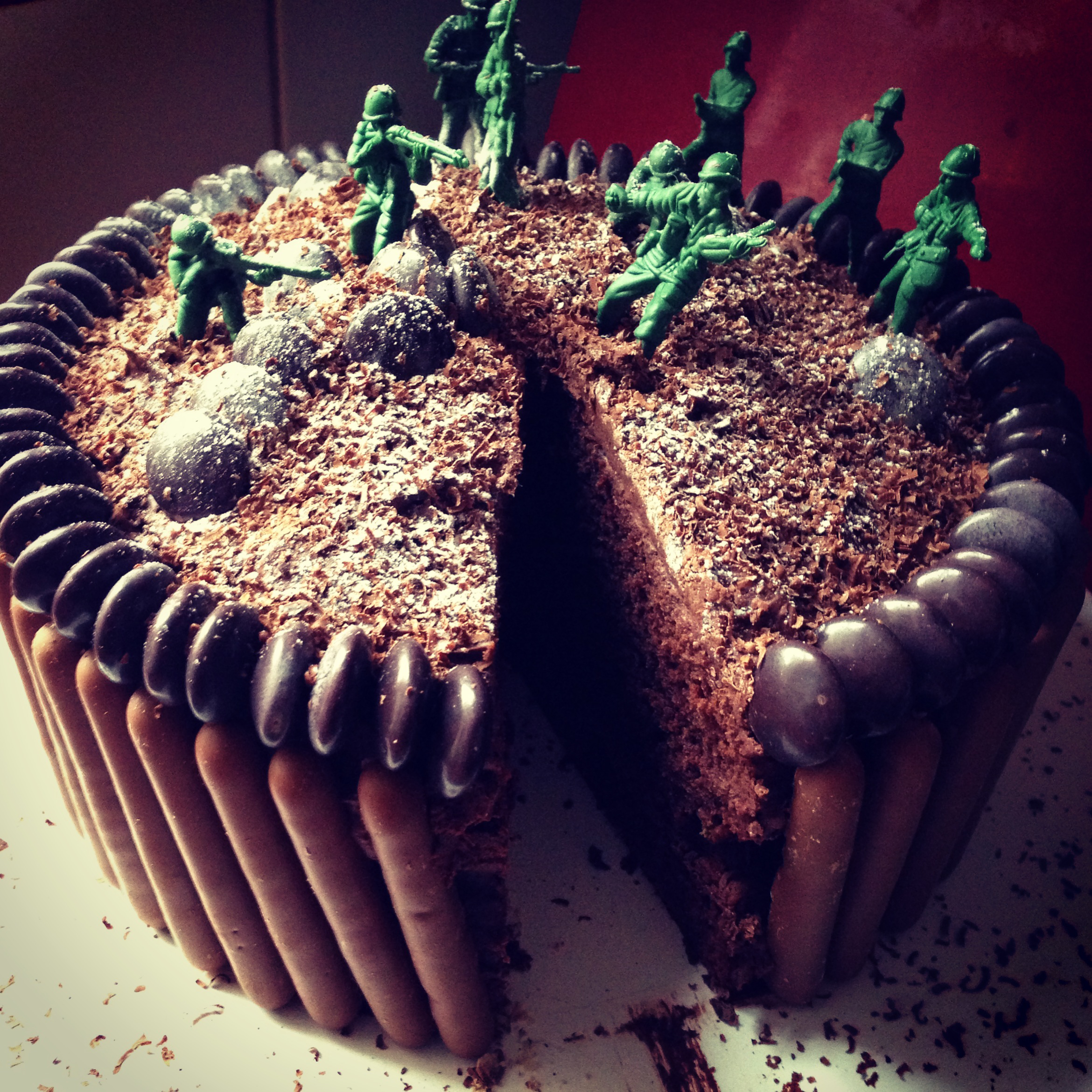 Cakes for people who hate baking have got to be pretty kickass in some way as an incentive to actually bake the bloody things. For me this is usually achieved by packing them full of booze and making them ridiculously easy to make, unfortunately I had no booze and all I had decoration wise in the pantry was some crystallised flowers and edible glitter, not exactly the butchest of decorations, so I popped out and bought a bag of toy soldiers instead, aces.