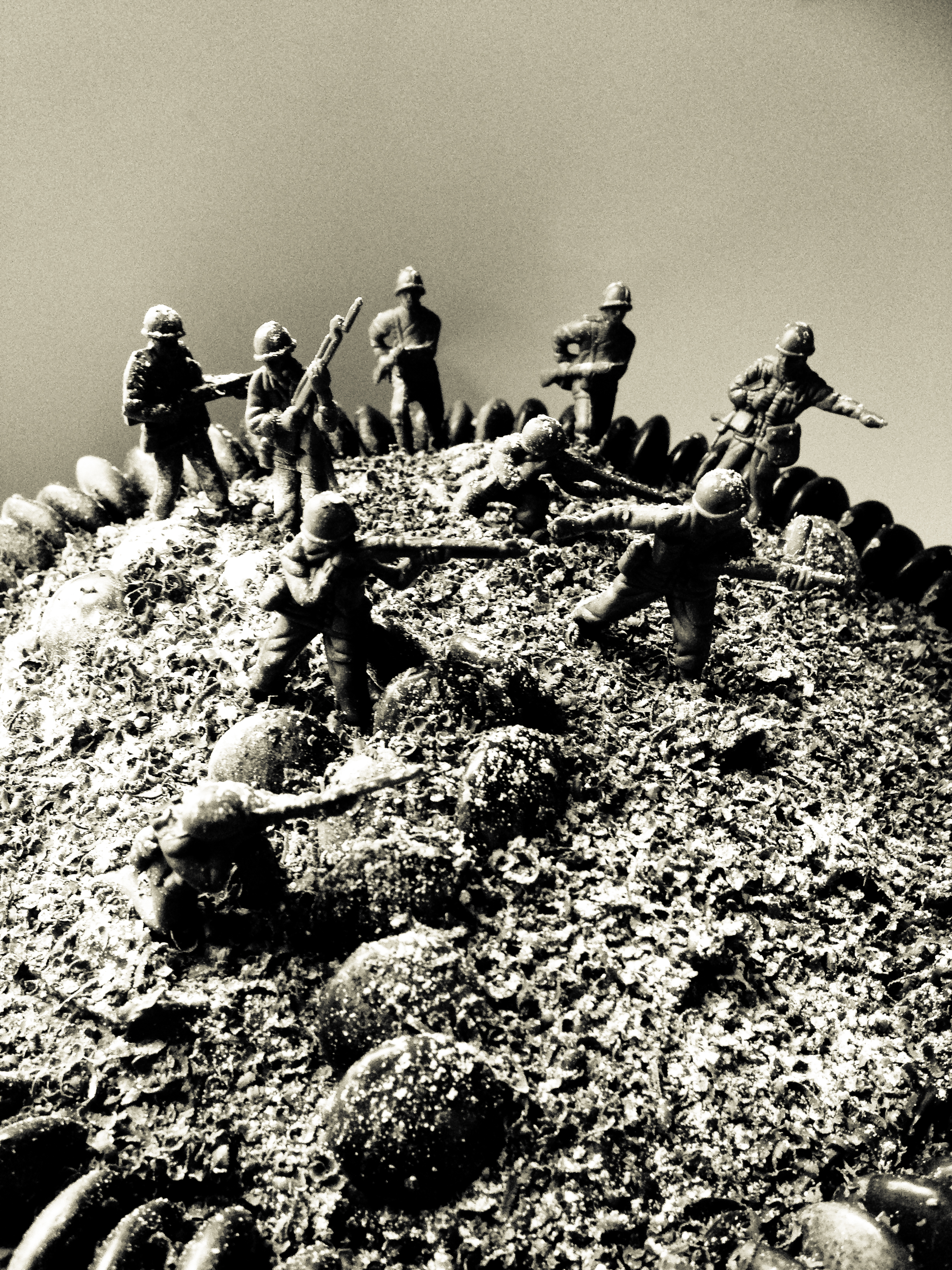 I picked up a bag of toy soldiers from Co-op for 50p, they have little plastic bases that just needed a camouflage smear of fudge icing before being positioned, a few more Minstrels served as rocks…