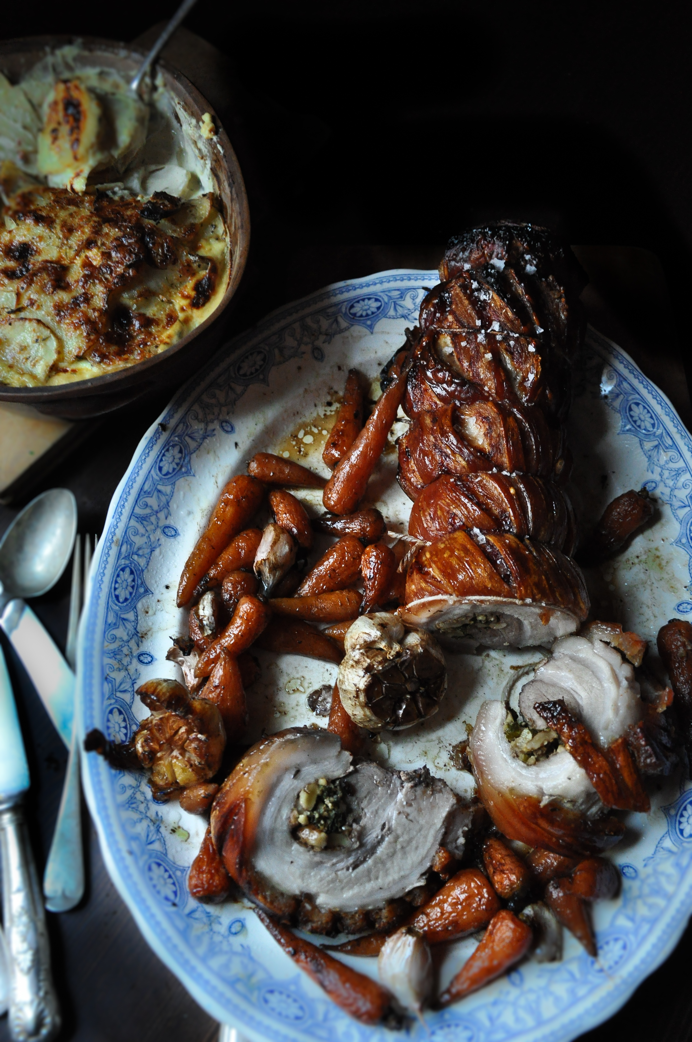 Last year I made this for my friend Jess whom I hadn’t seen in 20 years, I basically rocked up with a crate of cooking gear at her gorgeous farmhouse in Dorset and we got hammered on wine, reminisced about our time at school in Colwyn Bay and cooked together, it was heaven. Jess has a big Aga which is perfect for cooking this in, just whack it in the hot oven for 30 minutes or until the skin crisps up then add the cider, cover and move to the gentler oven and leave for about 5 or 6 hours whilst you drink lots of wine. You can pretty much forget about it as it pootles along doing its own thing. I think I cooked for about 12 that night, none apart from Jess I had met before and we had the most fabulous boozy feast that lasted until dawn when Jess accidentally picked up a tube of Veet hair remover cream instead of toothpaste and brushed her teeth, OUCH (you can read more about Jess’s escapades in Dorset in her column for Dorset Life or on her the uncensored versions on her hilarious blog The Dorset Chronicles- Diary of a Farmer’s Wife). The pork however was triumphant, it was an Oxford Sandy & Black pig reared by Jess and her husband Jasper, my god it was without a doubt the best pork I’ve ever eaten, I’ll never forget it.