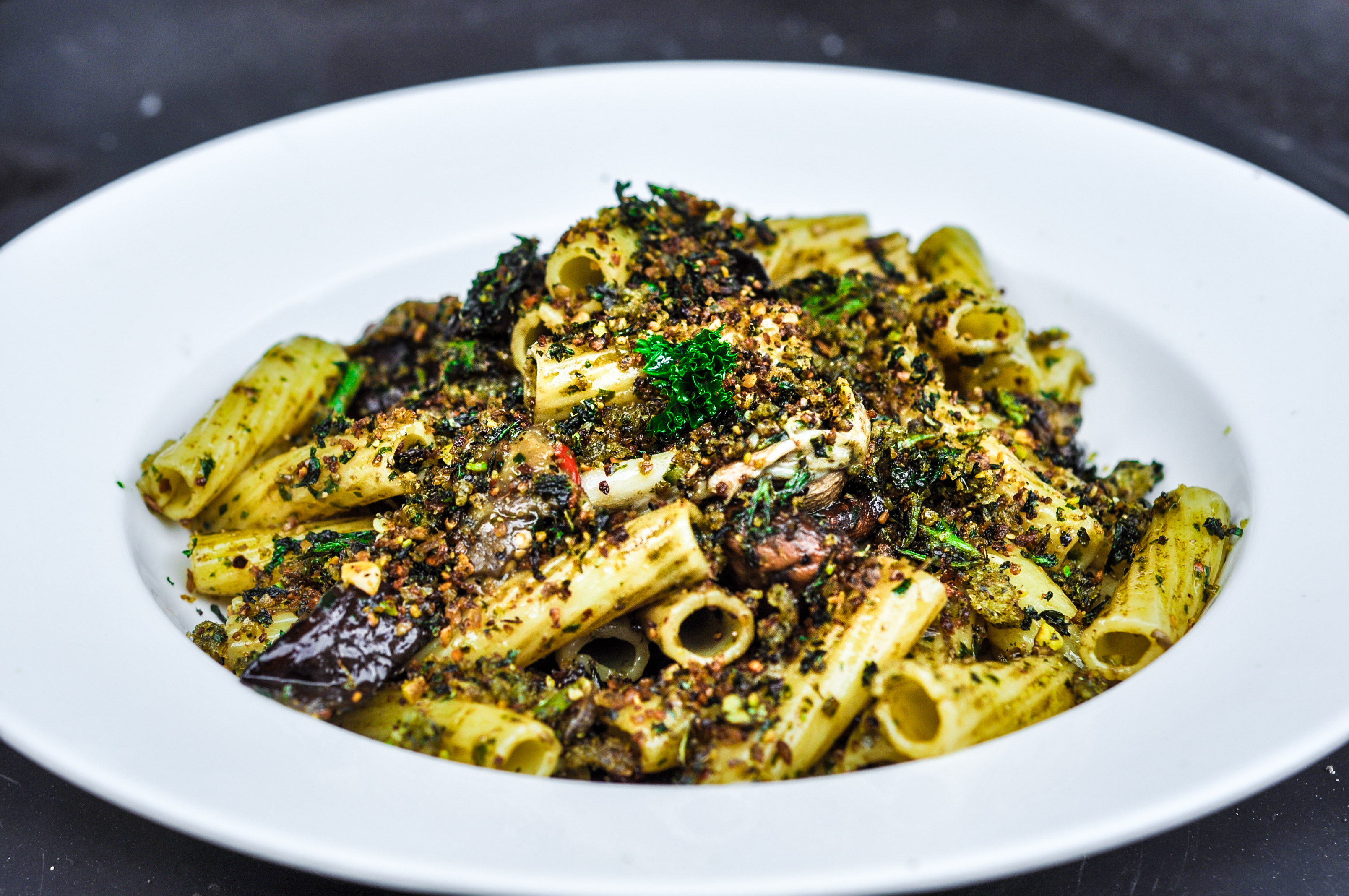 Ink cap rigatoni with pesto and kale and pistachio pangrattato