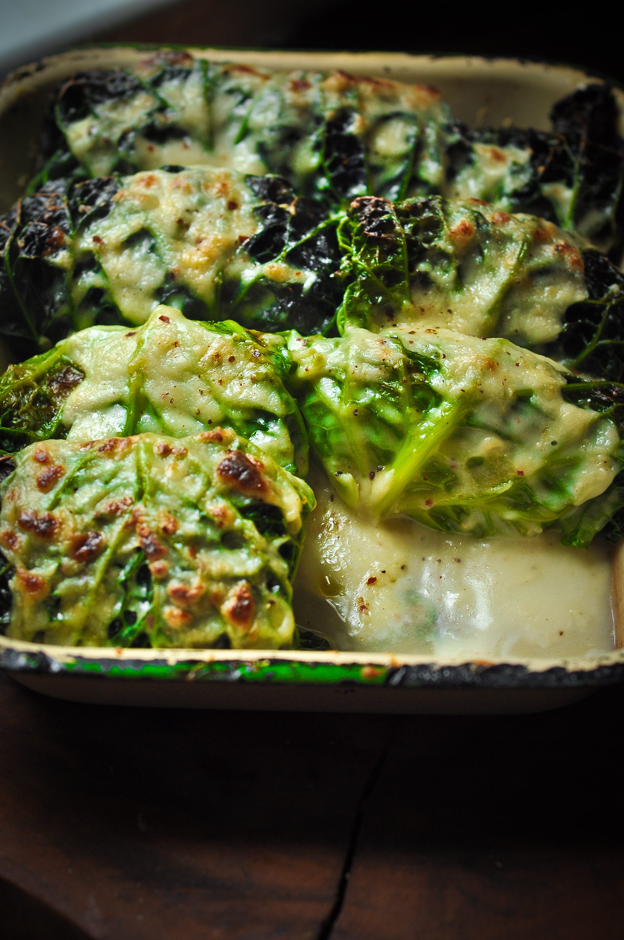 - To assemble take a cabbage leaf and a big dollop of skirlie and make a little parcel by folding over the top, then tuck in the sides and roll the whole thing up. Put in a roasting tray, repeat with the rest. Spoon over the sauce, grate over some extra cheese then roast until the sauce and cheese starts to turn golden.