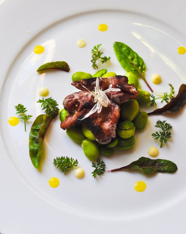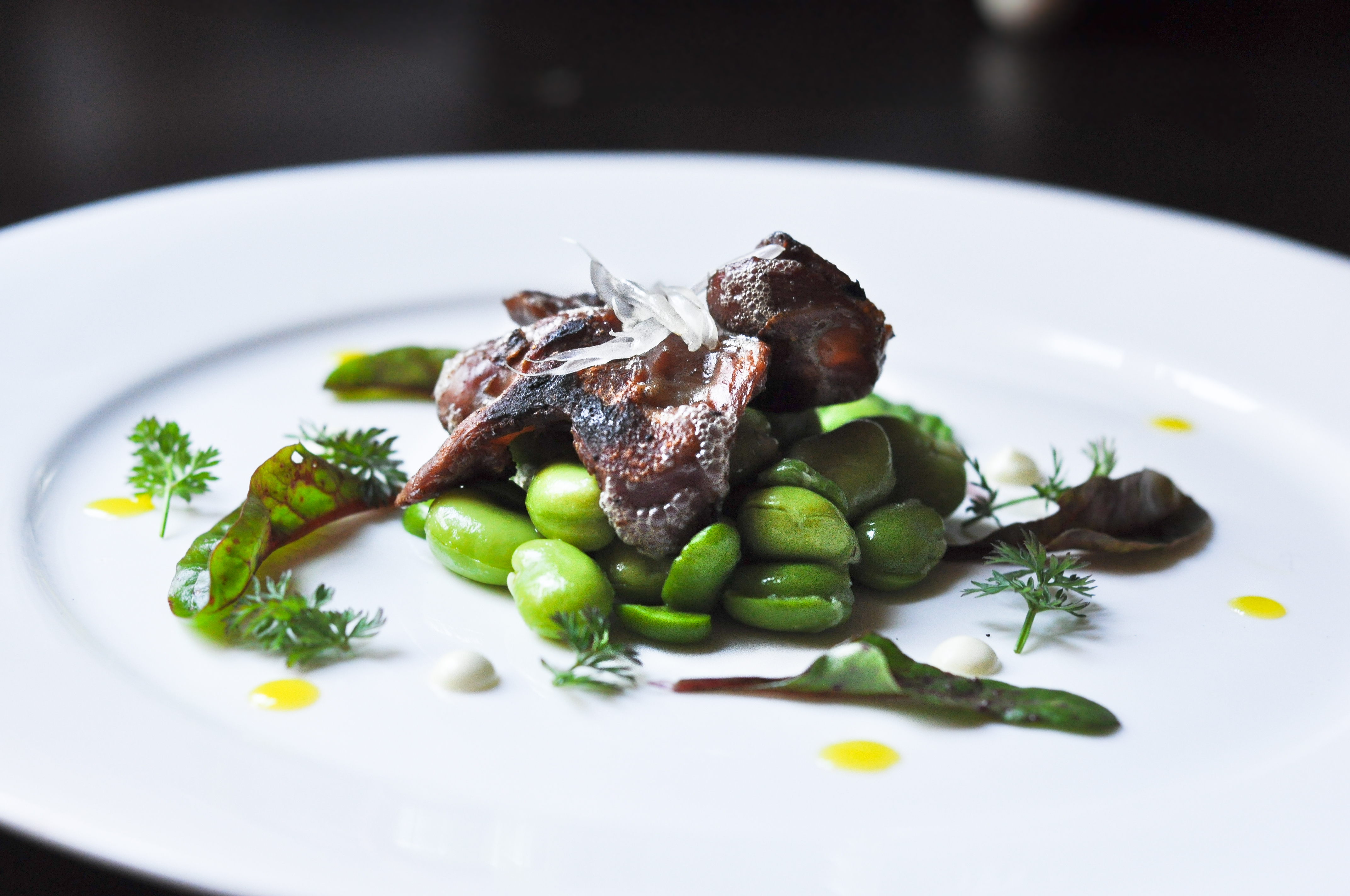 - To assemble simply put some of your smoked butter samphire on a dish, top with sweetbreads, surround with your elderflower poached gooseberries (and a bit of syrup), dot splurges of your sweet ketchup and scatter your herbs and flowers evenly about the plate. Dead easy, really tasty.